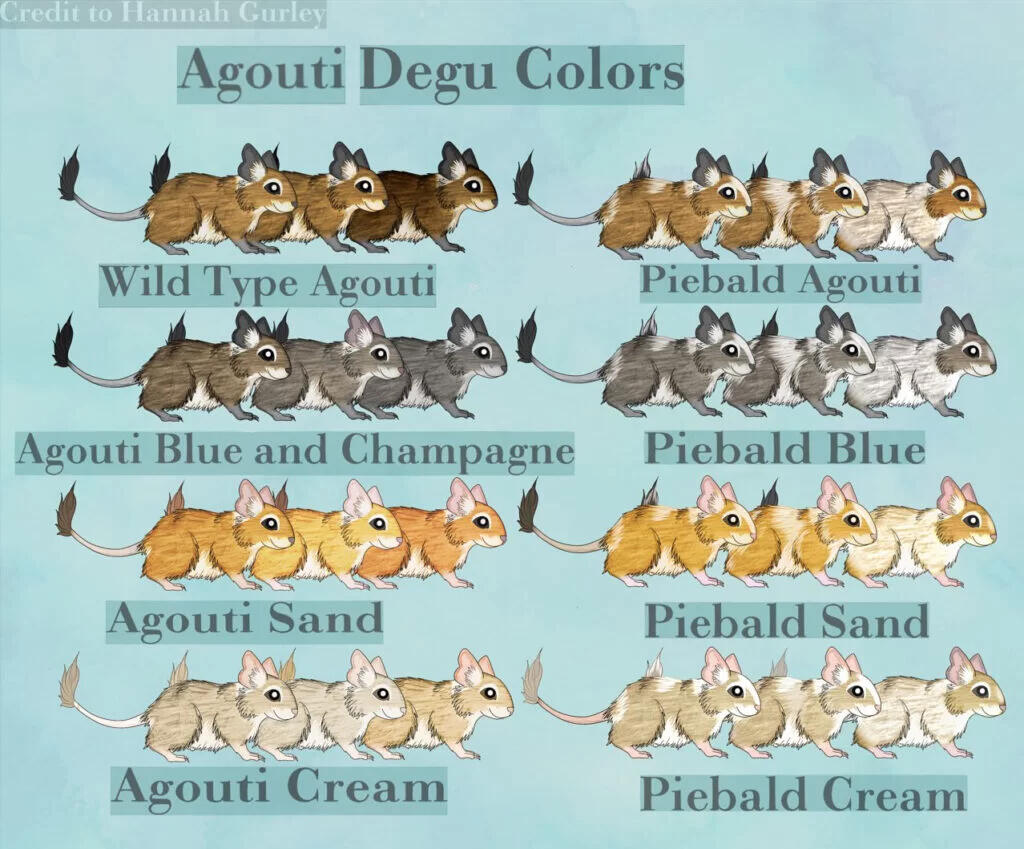 Breeding in captivity has created a variety of degu colorations! In the wild standard brown agouti is all you'll see. As pets you can find more colors such as blue, sand, cream, and black, along with piebald (white splotches) of each!Want to learn more about keeping degus as pets?Degutopia